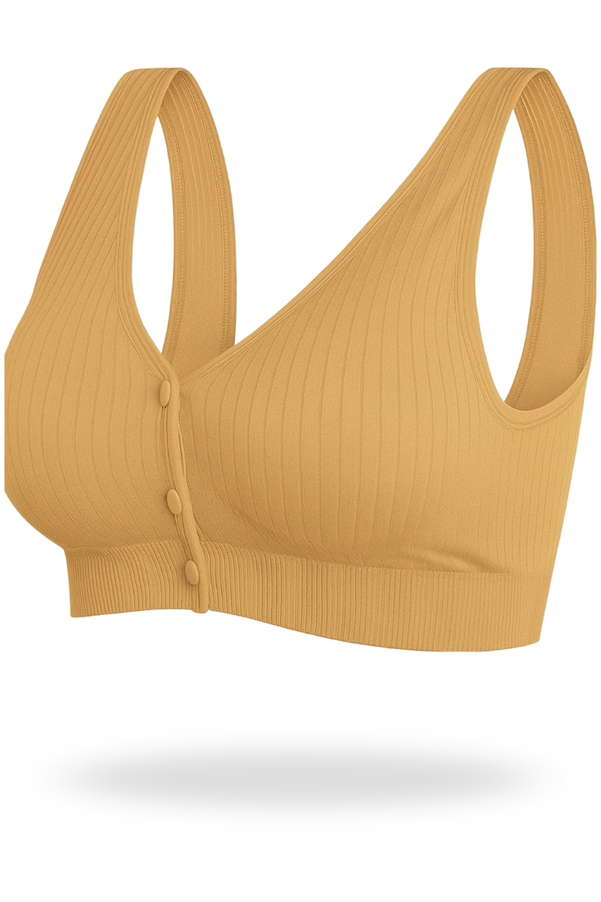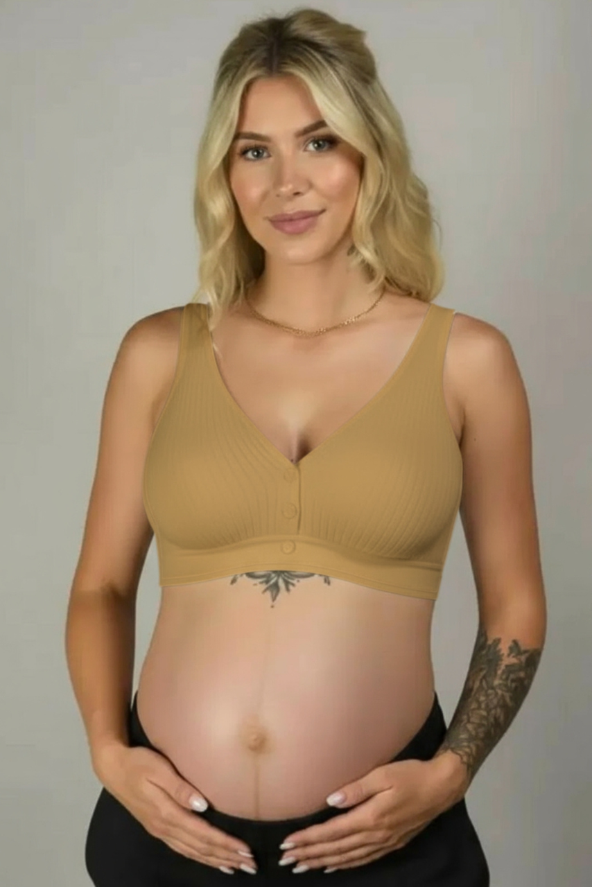 Miękki, prążkowany beżowy biustonosz do karmienia zapinany z przodu to połączenie komfortu i funkcjonalności w kobiecym wydaniu. Wykonany z elastycznego, przyjaznego dla skóry materiału, idealnie dopasowuje się do sylwetki i zapewnia pełną swobodę ruchów. Dzięki zapięciu z przodu na napy karmienie staje się szybkie i wygodne, a gładki tył bez zapięcia gwarantuje maksymalny komfort noszenia. Wyjmowane wkładki pozwalają dostosować kształt i podtrzymanie biustu do indywidualnych potrzeb.