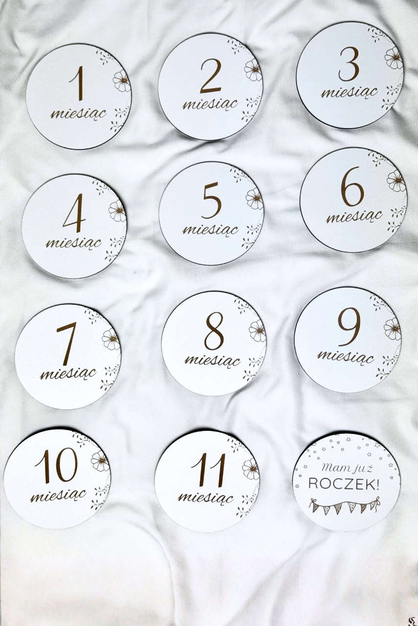 Białe karty do zdjęć z miesiącami – wzór kwiaty i girlanda