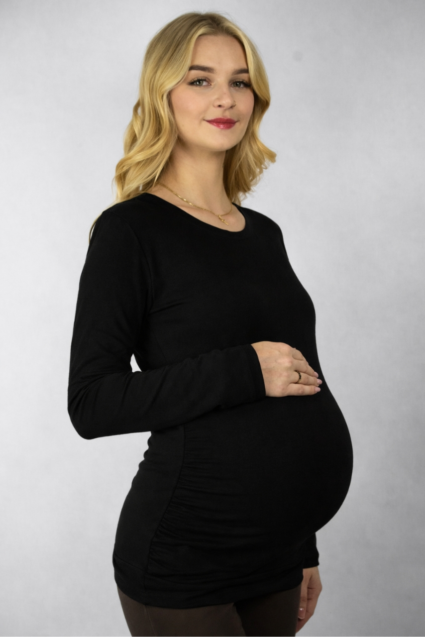 Subtelne marszczenia po bokach sprawiają, że czarna bluzka ciążowa z długim rękawem naturalnie układa się na brzuszku i nie krępuje ruchów, nawet w zaawansowanej ciąży. Klasyczny, prosty fason podkreśla sylwetkę, jednocześnie maskując drobne niedoskonałości i zapewniając pełną swobodę. Długi rękaw czyni ten model idealnym wyborem na chłodniejsze dni, ale równie dobrze sprawdzi się jako baza pod kardigan lub bluzę.