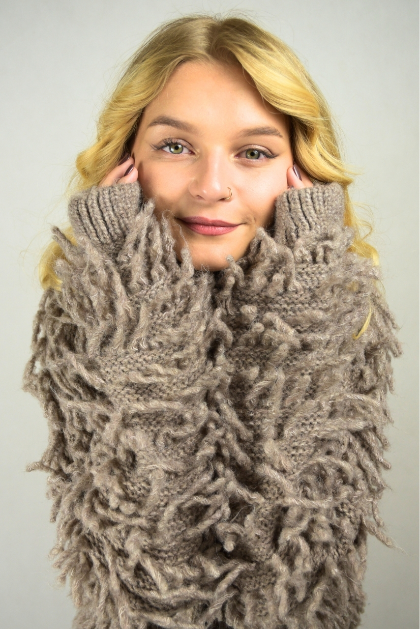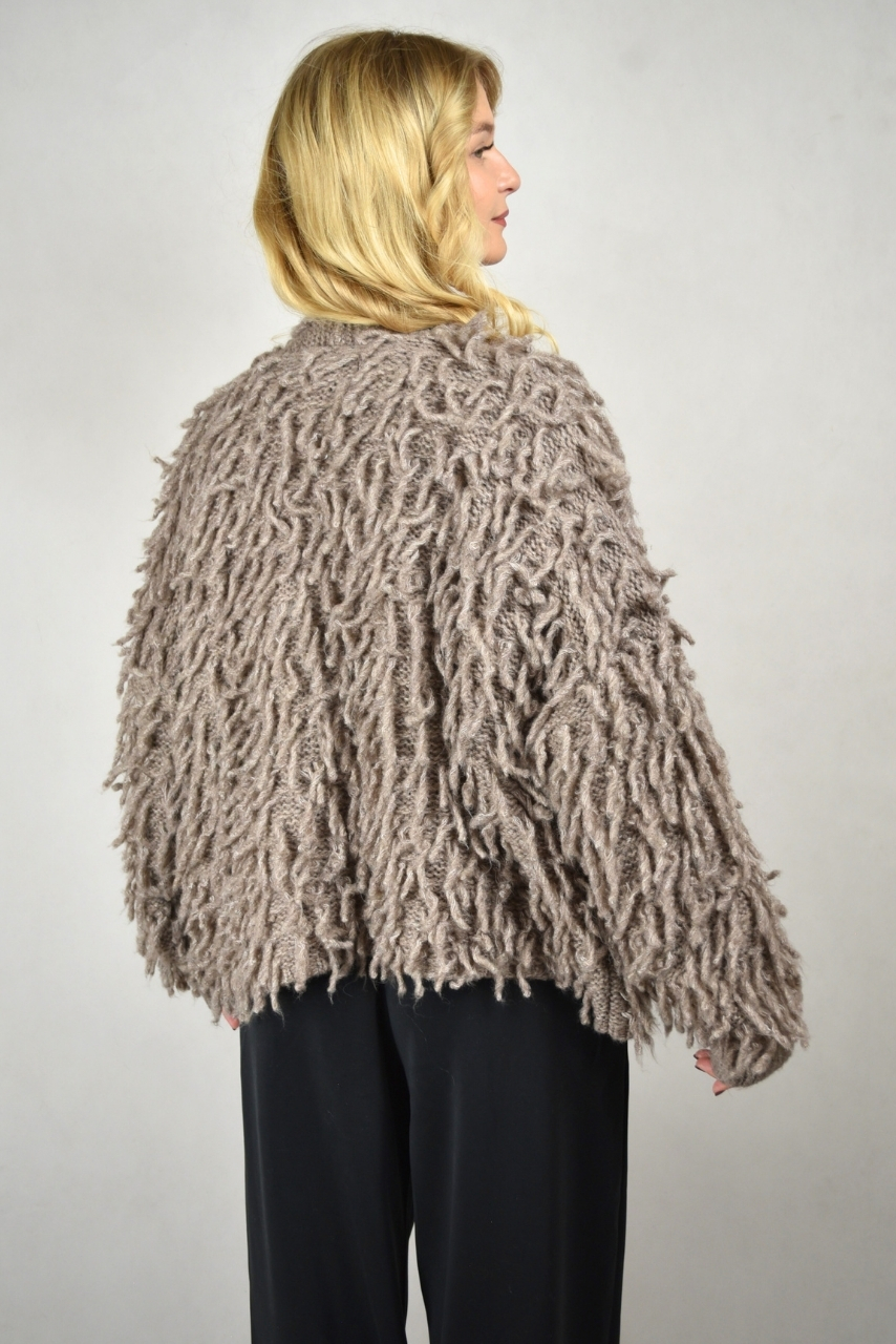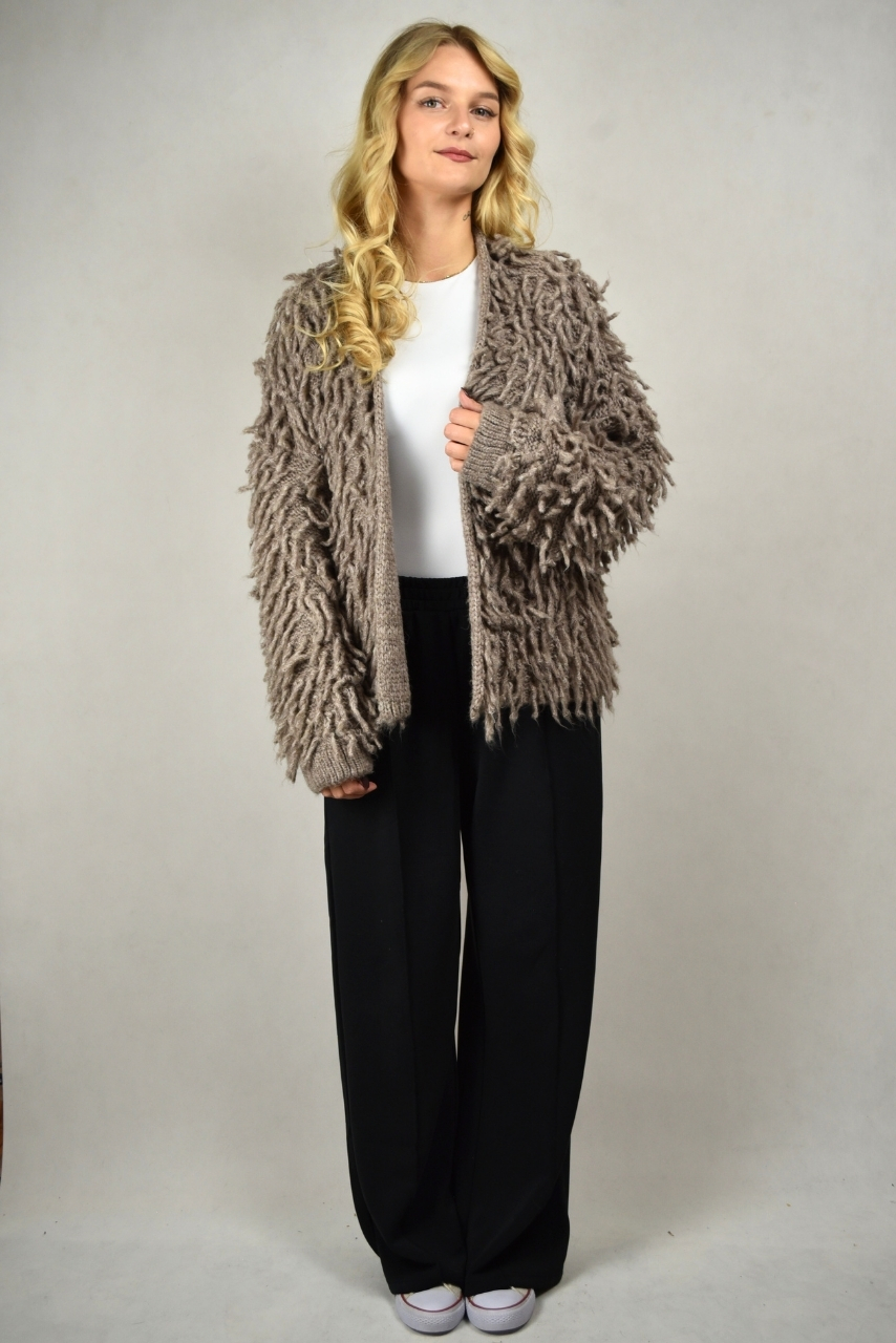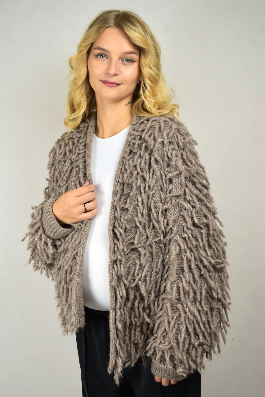 Rękawy zakończone ściągaczami dodają lekkości i podkreślają oversizowy charakter modelu. Kawowy kardigan z frędzlami doskonale komponuje się z beżami, czernią i bielą, tworząc spójny, stylowy look na co dzień. To model, który pokochasz za jego wygodę i ciepły, przytulny charakter.