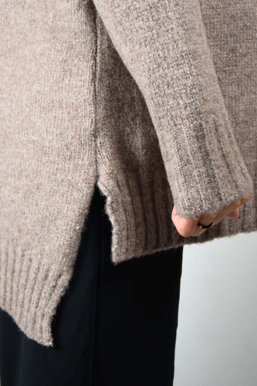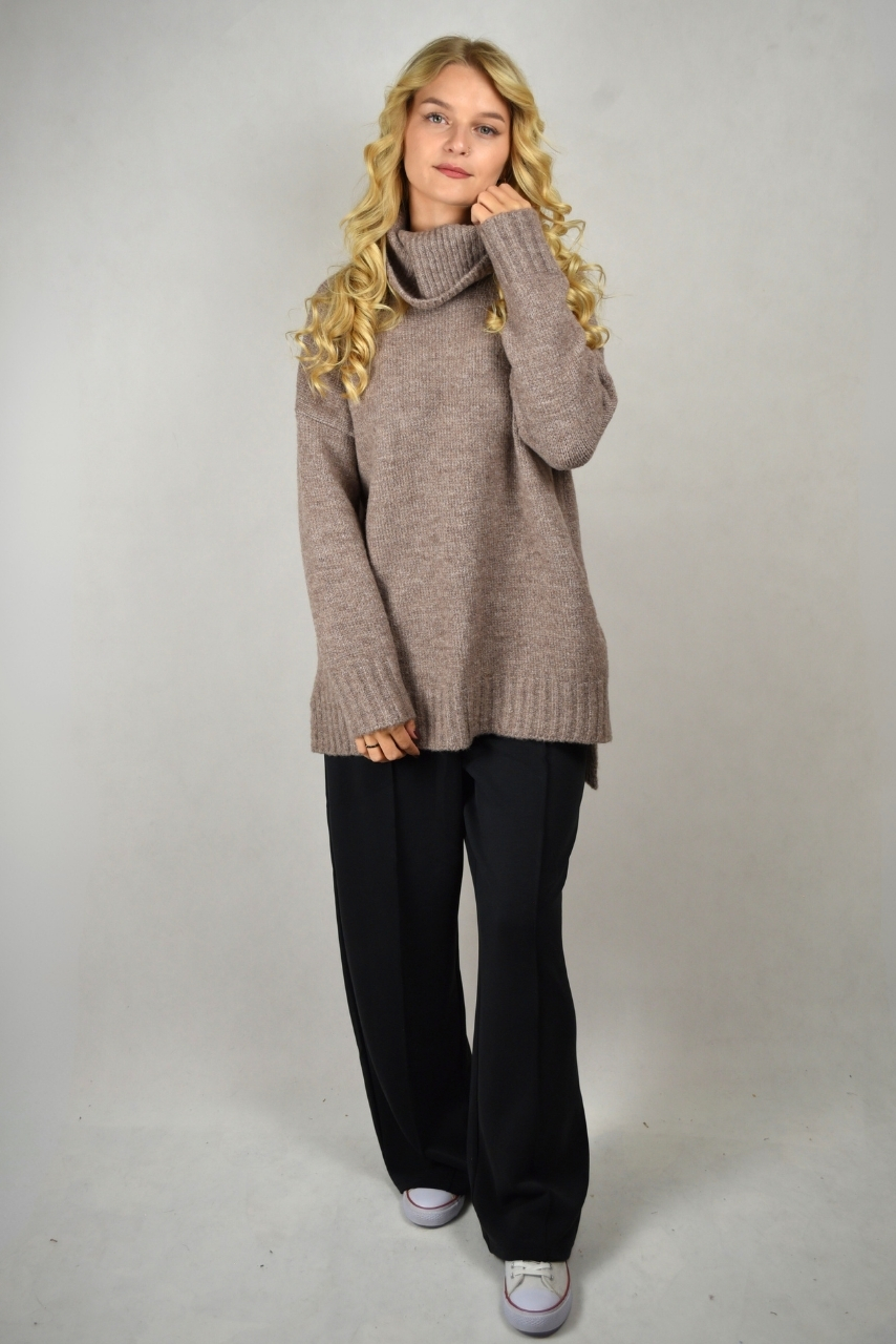 Kawowy sweter z szerokim golfem to kwintesencja przytulności i ciepła w eleganckim wydaniu. Miękka dzianina z dodatkiem wełny otula ciało, zapewniając maksymalny komfort w chłodniejsze dni. Oversizowy krój swobodnie układa się na sylwetce, a rozcięcia po bokach dodają lekkości i nowoczesnego wyglądu.