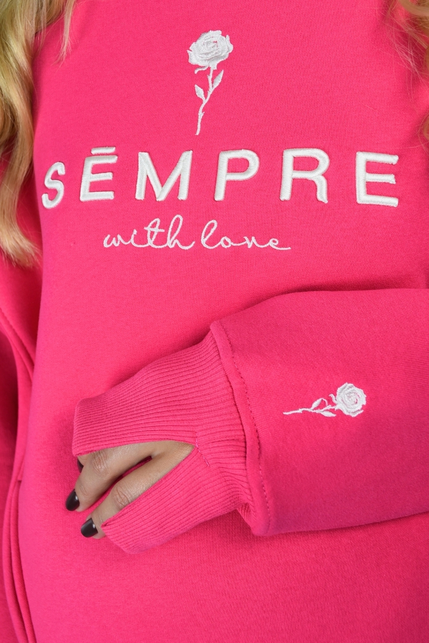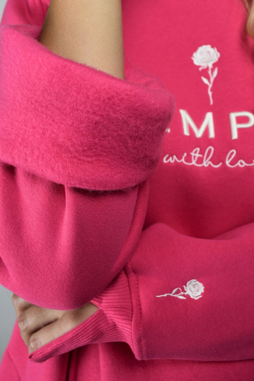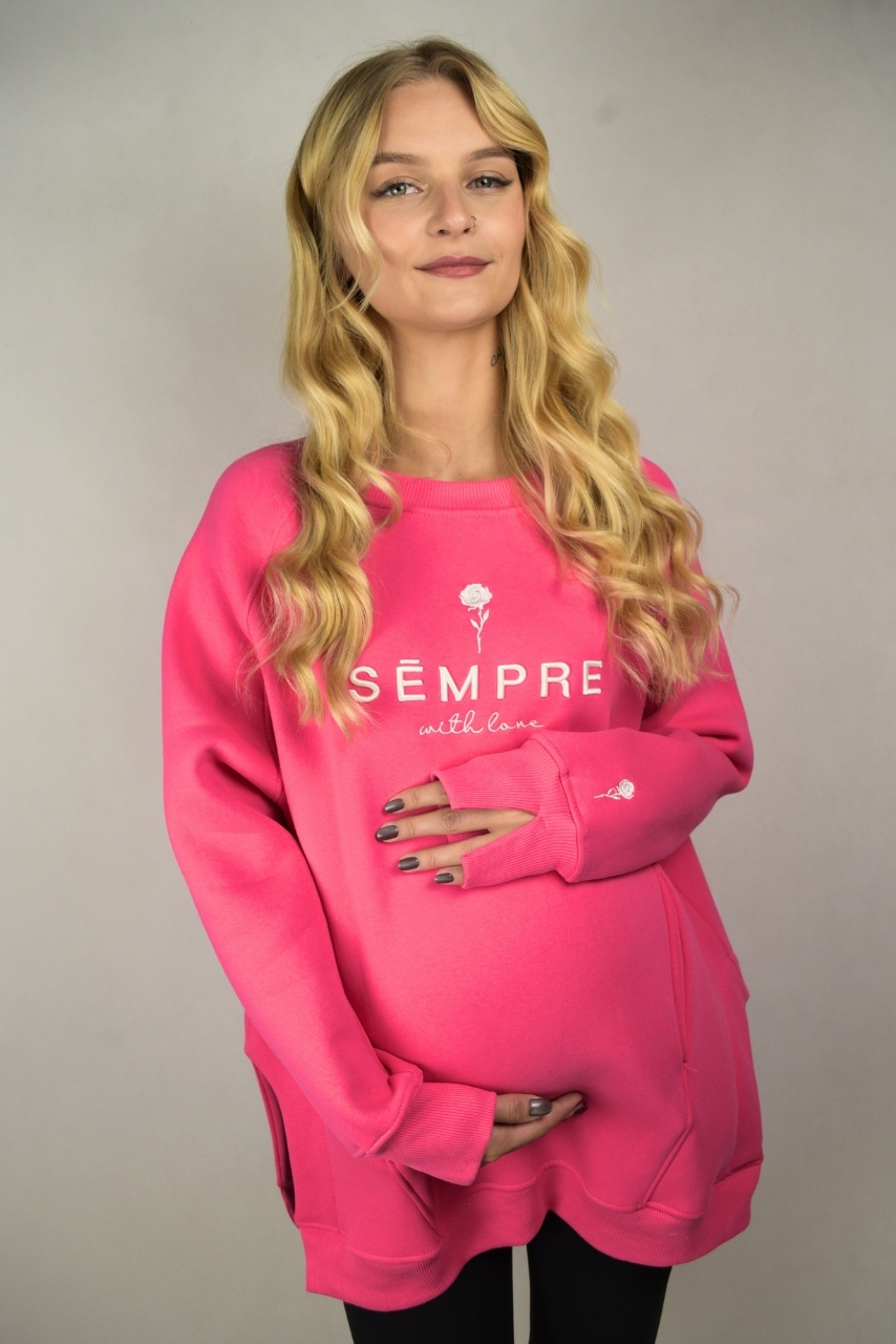 Stylowa i praktyczna różowa bluza ciążowa z wycięciami po bokach wykonana w 100% z wysokiej jakości bawełny. Intensywny, różowy kolor nadaje jej energii i kobiecego uroku, a subtelna różyczka oraz modny napis z przodu sprawiają, że prezentuje się wyjątkowo. Luźny krój, rozcięcia po bokach oraz ocieplany, miękki materiał sprawiają, że bluza doskonale sprawdzi się w okresie ciąży oraz długo po niej. Bluza ciążowa z haftowaną różyczką i napisem to wybór idealny zarówno na co dzień, jak i w domu – komfortowa, a jednocześnie stylowa. Różowa bluza ciążowa z wycięciami po bokach została zaprojektowana tak, by rosnący brzuszek miał pełną swobodę, a po porodzie nadal wyglądała modnie i wygodnie.