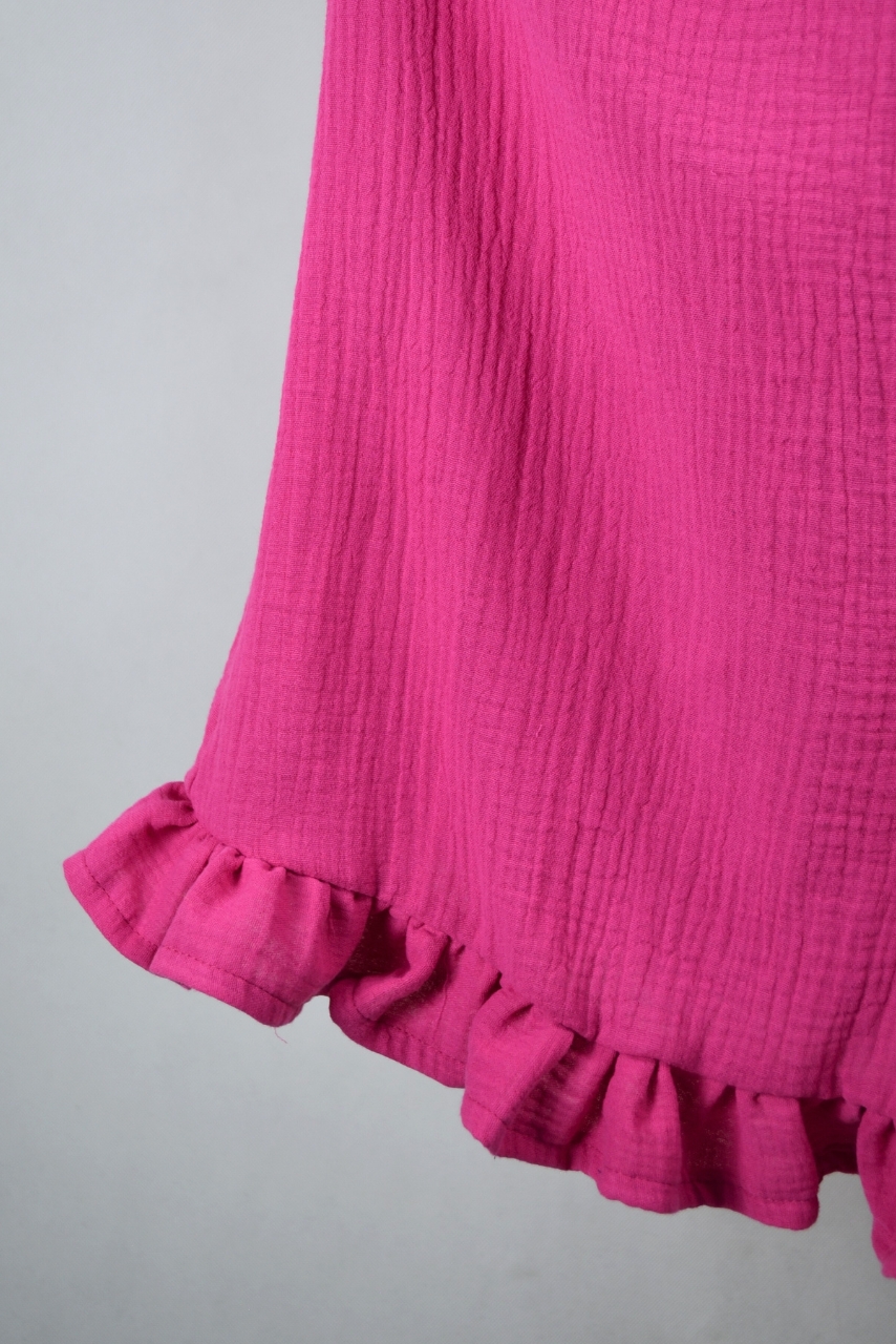 Sukienka ma praktyczne zapięcie na napy na całej długości, dzięki czemu dostęp do karmienia jest szybki i dyskretny. Luźny, swobodny krój pięknie układa się na sylwetce, a falbanka na dole dodaje jej uroku i lekkości. Różowa muślinowa sukienka do karmienia sprawdzi się nie tylko w domu, ale też na spacerze, urlopie czy spotkaniu ze znajomymi.